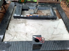 Когда подготовительные работы на территории могилы были завершены, мы принялись за укладку брусчатки на пескобетон, сама плитка была уложена вровень с облицованным гранитными плитами цоколем. Параллельно с этим мы подготовили основание для последующей установки надгробья.