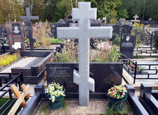 Изначально на месте захоронения находился лишь широкий горизонтальный памятник из чёрного гранита, разделённый на две половины светлым православным крестом. Клиент пожелал выгравировать на пустом пространстве памятник новую надпись, так как на могиле недавно произошло дозахоронение.